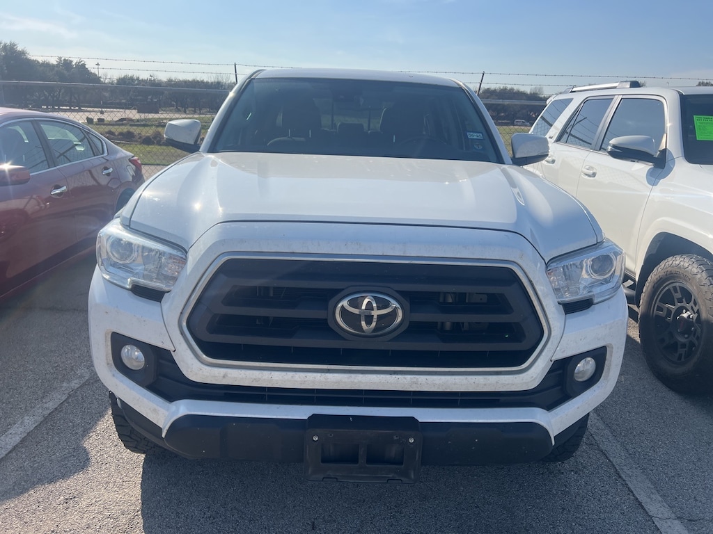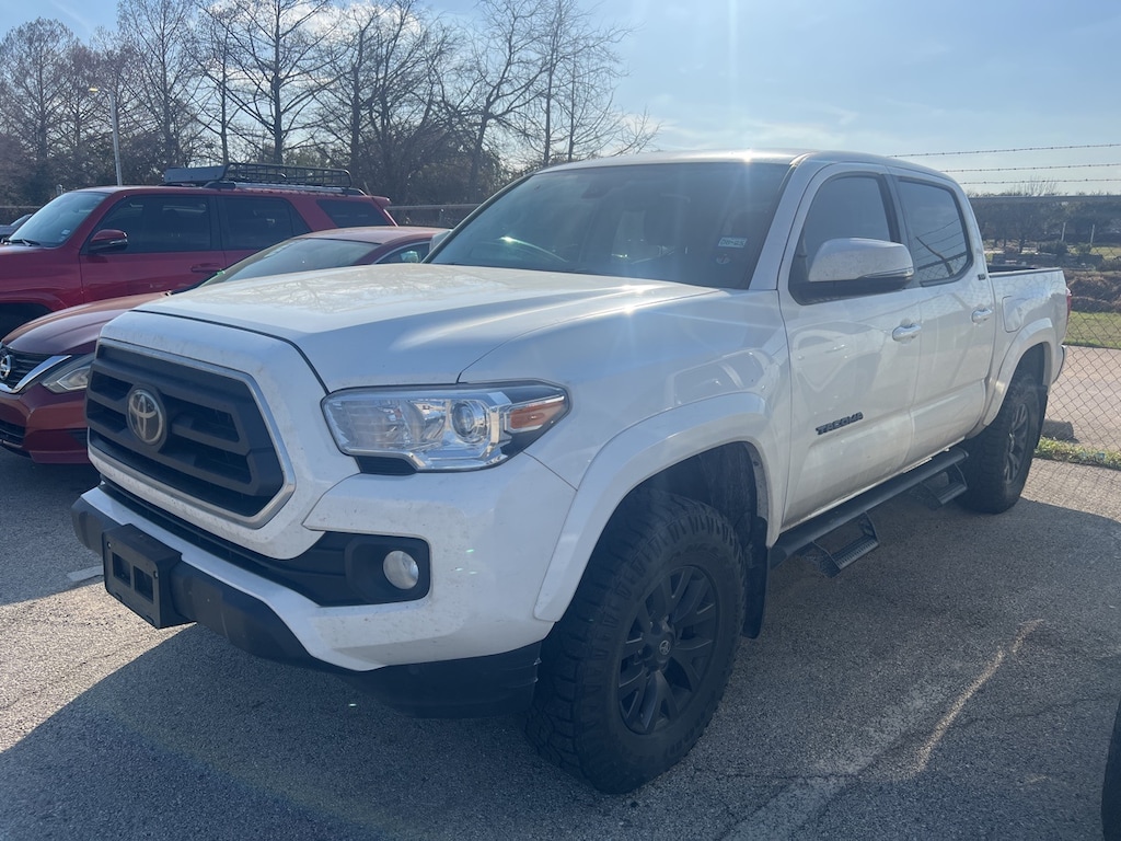 The 2023 Toyota Tacoma is a crew cab pickup with a short bed and a white exterior. It has a 6-speed automatic transmission and a 3.5L V6 engine.